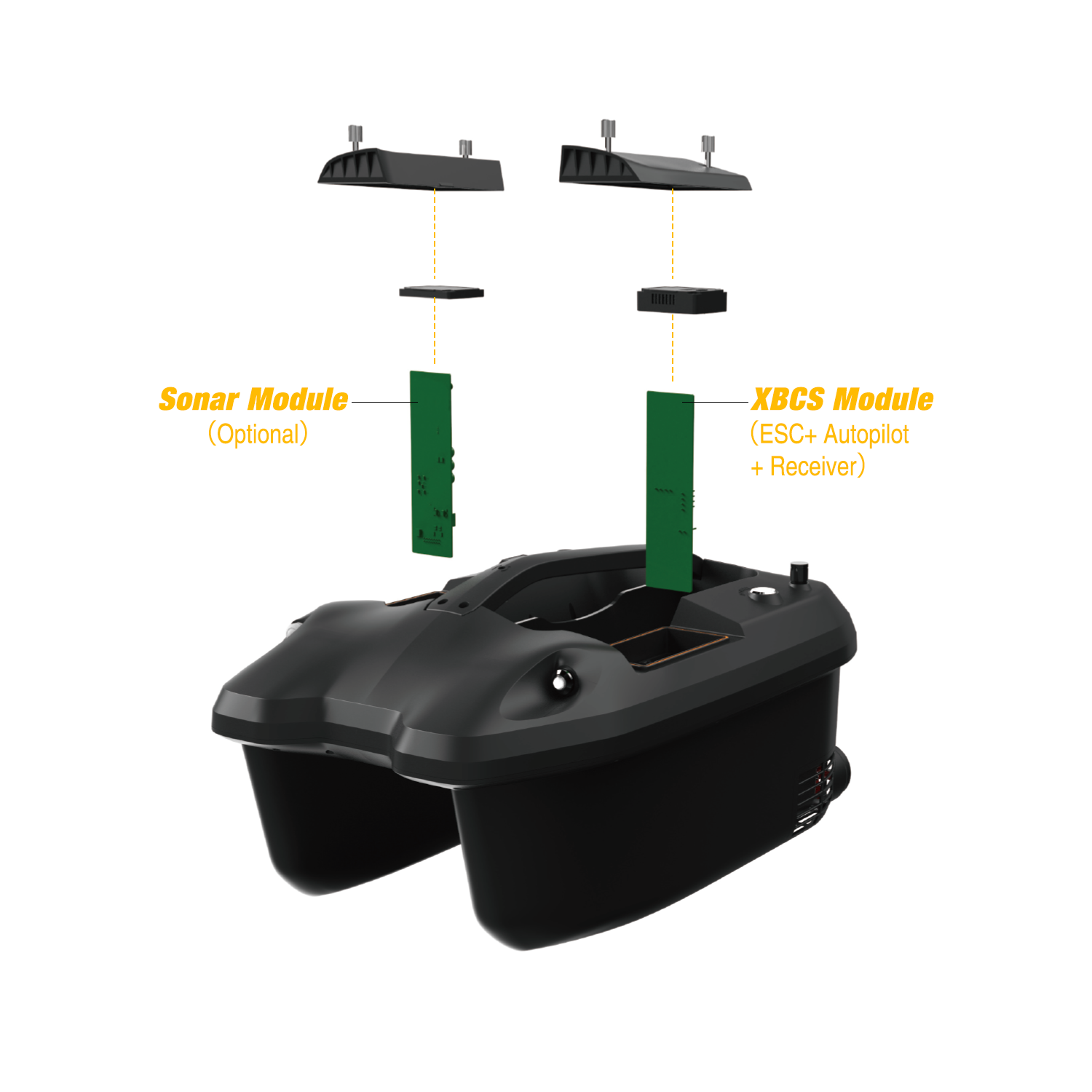 XBOAT-5 is a smart bait boat, which is generally used to help fisherman transporting baits to a target position on water. Xboat-5 Powerful Yet Silent.Dual high-torque brushless motors, Max speeds up to 6km/h, yet silent without disturbing fish. Moreover,XBOAT-5 controlling system were simplified into two board(sonar module and XBCS module). Most electronic repairs can be handled by fixing these two boards.